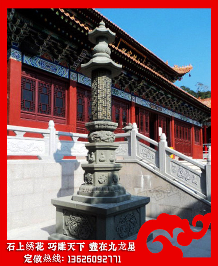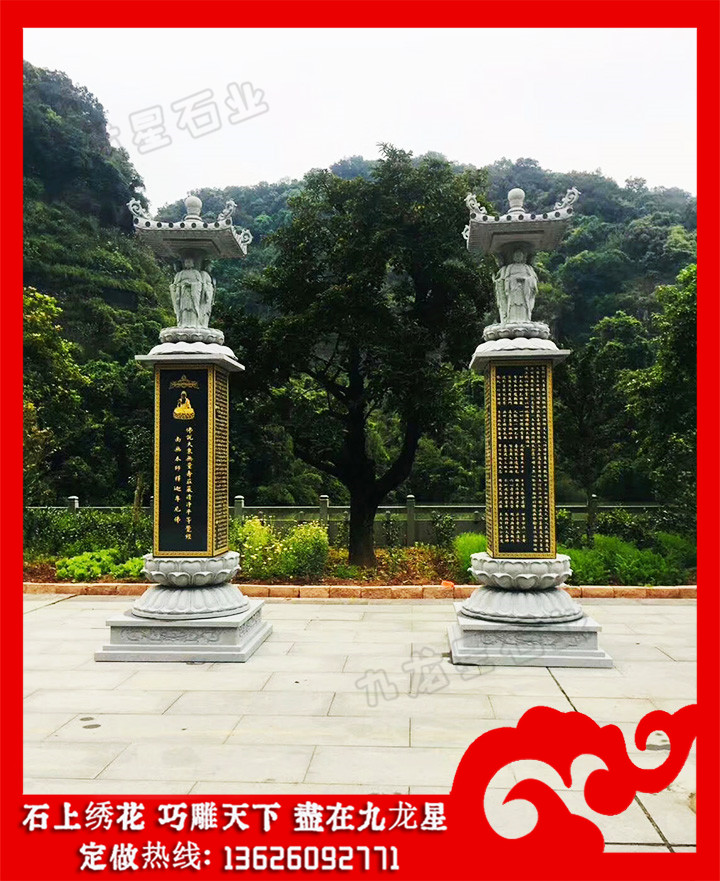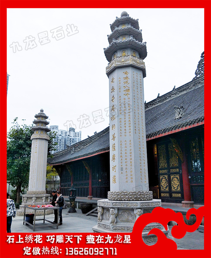 從現(xiàn)在的寺院建筑實(shí)例看,石雕石經(jīng)幢多立于佛寺大殿前的左右兩側(cè),它們已經(jīng)成為一座佛寺建筑群體中的一個(gè)有機(jī)的部分。既然石雕石經(jīng)幢具有消災(zāi)免罪的功能,所以有的已經(jīng)被用到佛寺以外的地方去了。其一是立在城市的街頭以求百姓的免災(zāi)祈福,可稱為“路幢”;其二是建于陵墓之前以求對(duì)墓主人超度亡靈,早日走入冥間天堂,可稱為“墓幢”。常見(jiàn)石雕石經(jīng)幢圖片樣式有很多,九龍星石業(yè)歡迎您帶圖咨詢。